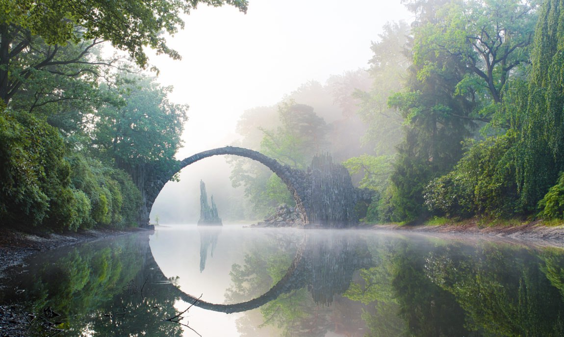 In the beautiful Saxony countryside, tucked away in the Gablenz region, you'll find a tranquil lake that is nothing short of magical. Set in the Kromlauer Park, Rakotzbrücke is the site of the mystical Devil's Bridge, a high arched bridge whose reflection in the water creates an almost perfect circle.